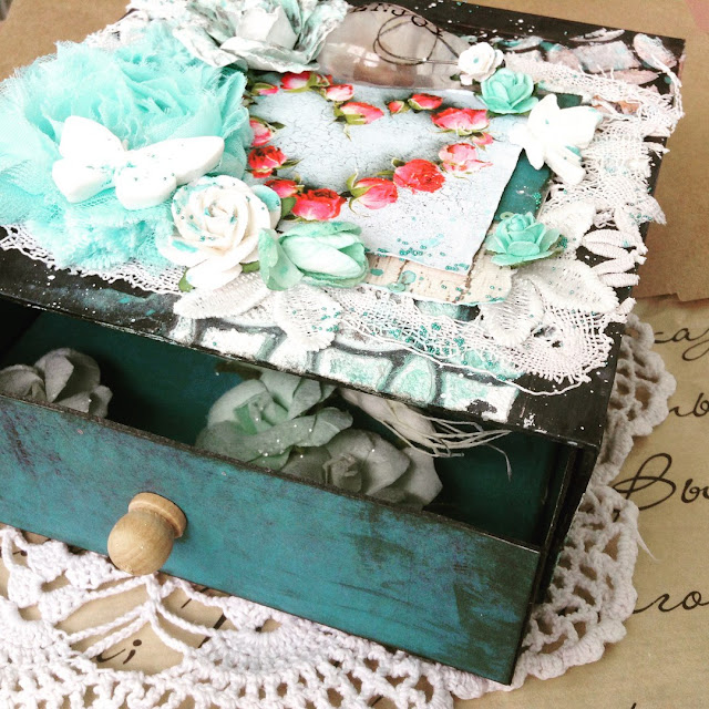 Вот такой у меня получился комодик. Обклеен кружевом и тонирован мятным цветом. Внутри ящичек сделан из очень плотной бумаги около 300 гр мятного цвета. В качестве ручки сделала кисточку и прикрепила на брадс. Украсила пайетками. Все цветочки, как обычно, самодельные. Такое вот сегодня мятное настроение))) Потому что сегодня увидела расцветающие подснежники) Наконец-то весна.