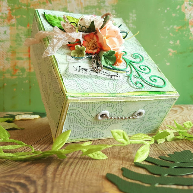 Вот такой весенний комодик хочу вам показать. Выполнен из переплетного картона, вся коробочка загрунтована, немного поигралась я со спреями, добавила к абрикосовому цвету немного кораллового. На кальке нотки символизируют весенние птичьи трели.