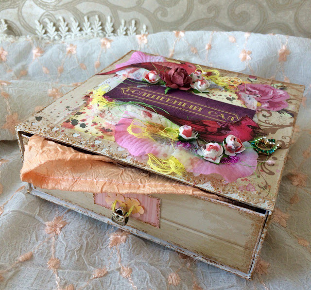 Спасибо Анфисочке!!! Сделала вместе на мастер классе на одном дыхании. Сама балдею от этого комодика. Очень мне нравится эта бумага от скрабберис с птичками-тащусь от неё! Крышечку сделала многослойной с использованием красочек, спреев, топпингов. Когда держишь в руках приятно до ужаса!!!